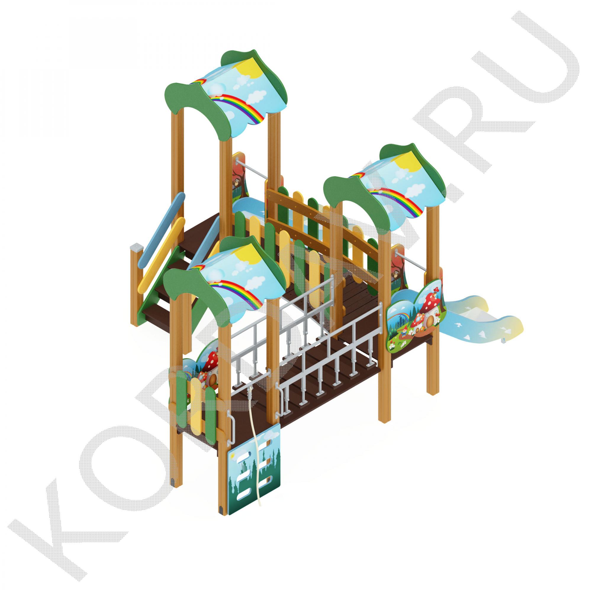 Игровая площадка представляет собой яркую многоуровневую конструкцию. Две горки, три домика, две пары ступенек и навесные мостики позволяют большому количеству детей играть вместе, а бортики по краям горок и по периметру всего комплекса обеспечивают детям безопасность.